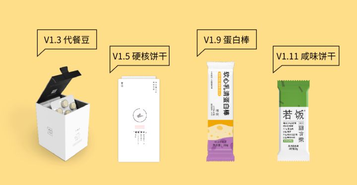 2015年5月29日,若饭发布固体版V1.0,形态是代餐豆,后续经历了硬核饼干、软心蛋白棒、咸味饼干等多种产品类型的底层迭代。